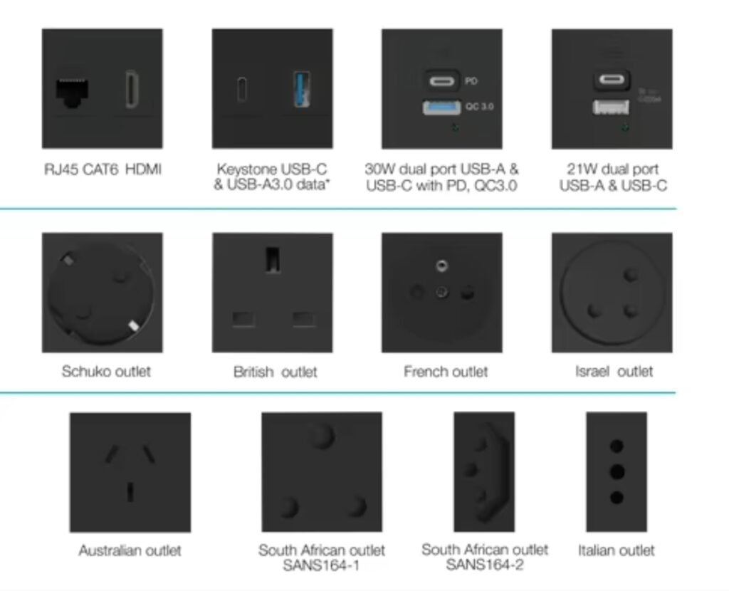 • US NEMA 5-15R • UK BS 1363 • EU Schuko • AU/NZ AS 3112